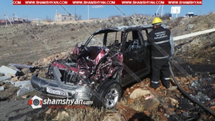 Խոշոր ավտովթար-հրդեհ՝ Արագածոտնի մարզում. Isuzu-ն բախվել է էլեկտրասյանն ու հայտնվել ձորում
