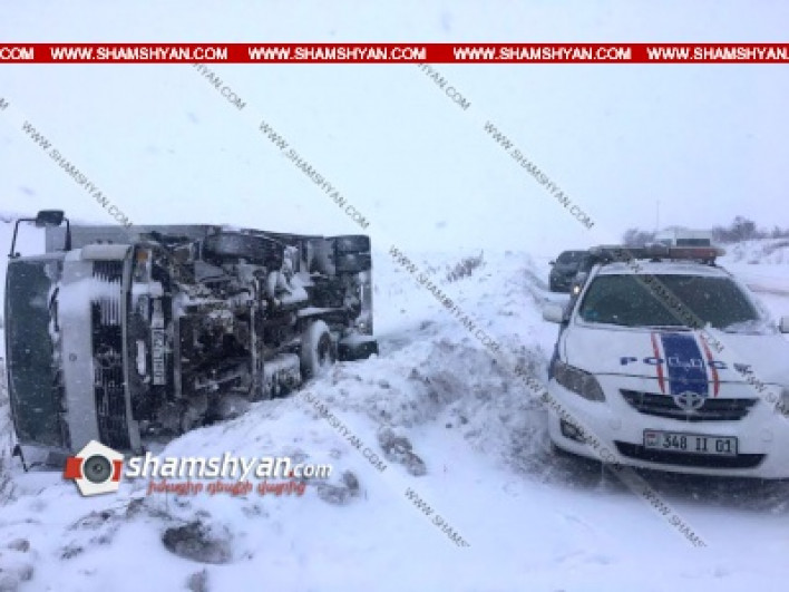 Ապարանում 8 տոննա անանասով բարձված բեռնատարը կողաշրջվել է. կա վիրավոր. ՖՈՏՈՌԵՊՈՐՏԱԺ