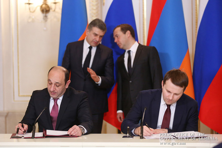 ՀՀ վարչապետի Ռուսաստանի Դաշնություն կատարած պաշտոնական այցի շրջանակում, ՌԴ վարչապետի կեցավայրում տեղի է ունեցել Դմիտրի Մեդվեդևի և Կարեն Կարապետյանի հանդիպումն ընդլայնված կազմով՝ երկու երկրների պաշտոնական պատվիրակությունների մասնակցությամբ: Աշխատանքային նախաճաշի շրջանակում, երկու երկրների պաշտոնական պատվիրակությունների հանդիպմանը քննարկվել է Հայաստանի Հանրապետության և Ռուսաստանի Դաշնության համար կարևորություն ներկայացնող հարցերի լայն շրջանակ: Համագործակցության ավանդական ուղղություններից բացի, կողմերը քննարկել են նոր ուղղություններով գործակցության ընդլայմանը նոր թափ հաղորդելու, ռուսական կապիտալը համատեղ նախագծերի միջոցով հայաստանյան բիզնեսում ներգրավելու հետ կապված հարցեր: Այս մասին հայտնում են ՀՀ կառավարությունից: Երկու երկրների կառավարությունների ղեկավարները, որպես օրակարգային առանցքային կետեր, առանձնացրել են համատեղ ներդրումային նախագծերի իրականացումը և ԵԱՏՄ ձևաչափով առևտրատնտեսական հարաբերությունների ամրապնդումը: Ընդլայնված ձևաչափով հանդիպման ժամանակ, մասնավորապես, քննարկվել է հայկական կողմի առաջարկը՝ հայ-ռուսական ներդրումային հիմնադրամ հիմնելու վերաբերյալ, որը հնարավորություն կտա ֆինանսավորելու Հայաստանի համար առաջնահերթ համարվող տնտեսական ճյուղերը: Ռուսական կողմն առաջարկը դրական է գնահատել: Կողմերն անդրադարձել են նաև Հայաստանում՝ Իրանի հետ սահմանակից հատվածում ազատ տնտեսական գոտու ստեղծմանը և դրանում ռուսական ընկերությունների ակտիվ մասնակցությանը: ՌԴ վարչապետ Դմիտրի Մեդվեդևը կարևորել է առաջարկը և կարծիք հայտնել, որ ռուսական ընկերություններն այդ հարցում հետաքրքրություն կդրսևորեն: Հանդիպման շրջանակում անդրադարձ է կատարվել նաև լիզինգային կամ այլ հիմունքներով Հայաստանին գյուղտեխնիկայի տրամադրման հարցին, կարևորվել է գյուղատնտեսության ոլորտում համատեղ ձեռնարկությունների հիմնման գաղափարը: Պաշտոնական պատվիրակությունների ընդլայնված կազմով հանդիպման ավարտին, Հայաստանի Հանրապետության և Ռուսաստանի Դաշնության համագործակցության խորացմանն ուղղված մի շարք փաստաթղթեր են ստորագրվել: Մասնավորապես, ստորագրվել են «Հայաստանի Հանրապետության էներգետիկ ենթակառուցվածքների և բնական պաշարների նախարարության և «Ռոսատոմ» ատոմային էներգիայի պետական կորպորացիայի (ՌԴ) միջև՝ 2015 թ. հոկտեմբերի 7-ի՝ «Հայաստանի Հանրապետության կառավարության և Ռուսաստանի Դաշնության կառավարության միջև միջուկային վթարի վերաբերյալ օպերատիվ իրազեկման ու միջուկային և ռադիացիոն անվտանգության բնագավառում տեղեկատվության փոխանակման մասին» համաձայնագրով նախատեսված պարտավորությունների կատարմանն ուղղված գործնական միջոցառումների իրականացման մասին» արձանագրությունը, «Հայաստանի Հանրապետության կառավարության և Ռուսաստանի Դաշնության կառավարության միջև միջտարածաշրջանային համագործակցության 2016-2021 թթ.» ծրագիրը, ինչպես նաև՝ Հայաստանի Հանրապետության տնտեսական զարգացման և ներդրումների նախարարության և Ռուսաստանի Դաշնության արդյունաբերության և առևտրի նախարության միջև համագործակցության հուշագիրը: Կողմերը հայտագրեր են փոխանակել 2000թ. սեպտեմբերի 25-ի՝ Հայաստանի Հանրապետության կառավարության և Ռուսաստանի Դաշնության կառավարության միջև՝ «Հայաստանի Հանրապետության և Ռուսաստանի Դաշնության քաղաքացիների համար առանց մուտքի արտոնագրերի փոխադարձ այցելությունների մասին համաձայնագրում փոփոխություններ կատարելու մասին» Հայաստանի Հանրապետության կառավարության և Ռուսաստանի Դաշնության կառավարության միջև համաձայնագիր: Հայաստանի Հանրապ