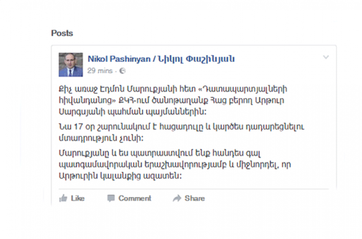 «Նա 17 օր շարունակում է հացադուլը և, կարծես, դադարեցնելու մտադրություն չունի։ Մարուքյանը և ես պատրաստվում ենք հանդես գալ պատգամավորական երաշխավորությամբ և միջնորդել, որ Արթուրին կալանքից ազատեն», - Facebook-յան իր էջում գրել է Նիկոլ Փաշինյանը։