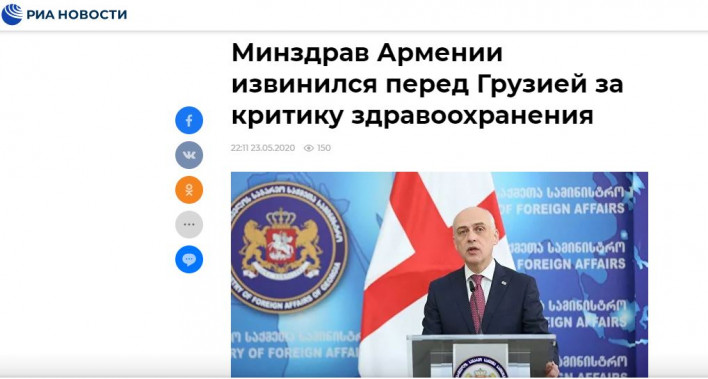 ՀՀ առողջապահության նախարարությունը դիվանագիտական ուղիներով իր ափսոսանքն է հայտնել պաշտոնական Թբիլիսիին՝ գերատեսչության ղեկավար Արսեն Թորոսյանի խոսքերից հետո, որը հայտարարել էր COVID-19- ի դեմ պայքարում վրացական ոչ բարվոք հակահամաճարակային համակարգի և առողջապահության մասին, հայտարարել է Վրաստանի ԱԳՆ ղեկավար Դավիթ Զալկալիանին: Այդ մասին գրում է РИА Новости-ն։