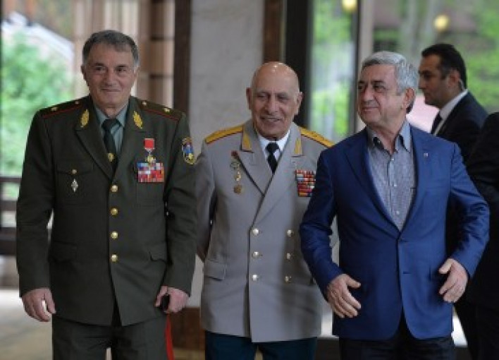 Աշխատանքային այցով Արցախի Հանրապետությունում գտնվող ՀՀ Նախագահ, Զինված ուժերի գերագույն գլխավոր հրամանատար Սերժ Սարգսյանն այսօր Շուշիում հանդիպում է ունեցել 2017 թվականին զորացրված, ինչպես նաև ներկայումս ժամկետային զինծառայության մեջ գտնվող և ծառայության ընթացքում անձնվիրության ու խիզախության համար խրախուսման արժանացած մի խումբ զինծառայողների և զորացրված սպաների հետ: Հանդիպմանը մասնակցել են ՀՀ պաշտպանության նախարար Վիգեն Սարգսյանը, ինչպես նաև լեգենդար զինվորականներ` գեներալ լեյտենանտ Նորատ Տեր-Գրիգորյանցը և գեներալ մայոր Արկադի Տեր-Թադևոսյանը, որոնց անցած ուղին օրինակ է ներկայիս զինծառայողների համար: