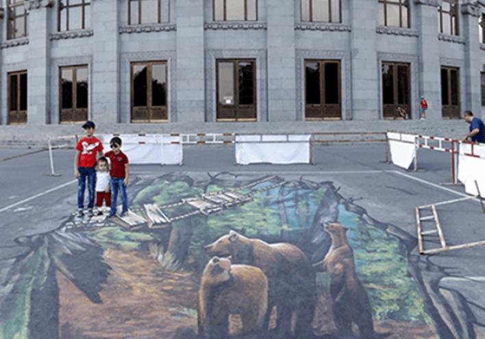 Երևանի քաղաքապետարանի նախաձեռնությամբ հերթական անակնկալն է մատուցվել մայրաքաղաքի բնակիչներին և հյուրերին: Ազատության հրապարակում ստեղծվել է հերթական եռաչափ նկարը (3D սթրիթ արթ)՝ այս անգամ ձորում զբոսնող արջերի պատկերով: Նկարը ստեղծվել է հատուկ ջրակայուն և ջերմակայուն ներկերով:
