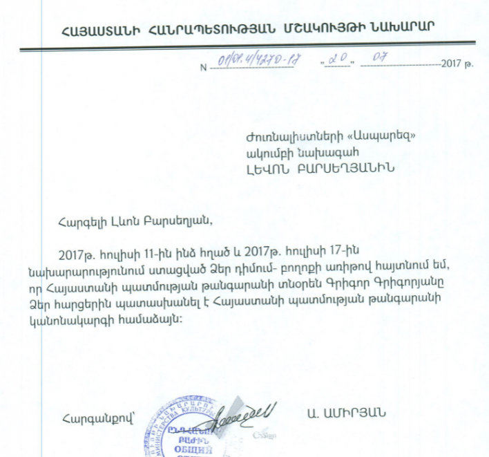 Ժուռնալիստների «Ասպարեզ» ակումբի հայտարարությունը Հայաստանի պատմության թանգարան ՊՈԱԿ-ի տնօրեն Գրիգոր Գրիգորյանի կողմից «Տեղեկատվության ազատության մասին» ՀՀ օրենքի պահանջի հետեւողական խախտման եւ այդ խախտումը մշակույթի նախարարի կողմից պաշտպանելու մասին 2017 թվականի հունիսի 29-ին Ժուռնալիստների «Ասպարեզ» ակումբը հայտարարություն էր տարածել այն մասին, որ Հայաստանի պատմության թանգարան ՊՈԱԿ-ի տնօրեն Գրիգոր Գրիգորյանը, խախտելով «Տեղեկատվության ազատության մասին» ՀՀ օրենքը, չի պատասխանում ակումբի խորհրդի նախագահի տեղեկության հարցմանը:Հայտարարության հրապարակումից հետո թանգարանի տնօրենը բարեհաճեց պատասխանել հարցմանը, սակայն հարցված տեղեկությունները տրամադրեց ոչ թե ամբողջությամբ, այլ մասնակիորեն: Մասնավորաբար, փաստացի չի տրամադրել թանգարանային առարկաների ցանկը. (Հարցմամբ.-1. Հայաստանի պատմության թանգարան ՊՈԱԿ-ի տնօրինած թանգարանային բոլոր առարկաների անվանացանկը, նշելով, թե հարցմանը պատասխանելու դրությամբ որտեղ են գտնվում այդ առարկաներից յուրաքանչյուրը. ցուցադրություն թանգարանում, ցուցադրություն այլ վայրում, պահոց եւ այլն):Դրա փոխարեն թանգարանի տնօրենը պատասխանում գրել է. «...Ելնելով թանգարանում գործող ներքին կանոնակարգից՝ հավելյալ ամբողջական տեղեկություն իրավասու չենք ներկայացնելու: Ձեզ հետաքրքրող որեւէ նմուշի մասին տեղեկույթ պատրաստ ենք տրամադրել՝ Ձեր դիմումի դեպքում, որտեղ նշված լինի նմուշի անվանումը եւ տեղեկույթ ստանալու նպատակը»:Համարելով, որ այս պատասխանը եւ Հայաստանի պատմության թանգարանի ունեցվածքը քաղաքացիներից գաղտնի պահելը ակնհայտ ապօրինություն է, ինչը հակասում է գործող օրենսդրությանը եւ Հայաստանի ստանձնած միջազգային մի շարք պարտավորություններին, ակումբի խորհրդի նախագահը 2017 թ. հուլիսի 11-ին բողոք է հղել ՀՀ մշակույթի նախարարին: Նախարարը, սակայն, անկարող լինելով կամ չկարողանալով կարգի հրավիրել ՊՈԱԿ տնօրենին, պատասխանել է, թե տնօրենը հարցմանը պատասխանել է թանգարանի կանոնակարգին համապատասխան:Այնինչ Հայաստանի պատմության թանգարանի տնօրենը խախտել է «Տեղեկատվության ազատության մասին» ՀՀ օրենքի պահանջը, ըստ որի պարտավոր էր հարցված եւ օրենսդրությամբ գաղտնիք չհանդիսացող տեղեկությունները տրամադրել հարցումը ներկայացնողին 5-օրյա ժամկետում, իսկ լրացուցիչ աշխատանք կատարելու անհրաժեշտության դեպքում՝ 30-օրյա ժամկետում: Թանգարանի տնօրինած թանգարանային առարկաների ցանկի տրամադրման մերժումը ակնհայտ ապօրինություն է, որը վերացնելու փոխարեն մշակութի նախարարը, փաստորեն, պաշտպանել է այն: Մշակույթի նախարարը ապօրինության այս սատարմամբ այլ ճանապարհ չթողեց տեղեկություններն ստանալու համար, քան դատական ճանապարհը: Ժուռնալիստների «Ասպարեզ» ակումբը դատապարտում է այս իրավազանցությունը, եւ տեղեկացնում, որ բոլոր ջանքերը գործադրելու է ՀՊ թանգարանի բոլոր ցուցանմուշների մասին պատշաճ տեղեկություններ ստանալու, հրապարակելու եւ ՀՊԹ ՊՈԱԿ տնօրենին վարչական պատասխանատվության ենթարկելու համար: