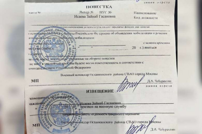 Մոսկվայում 41-ամյա Զեյնաբ Իսաևան ծանուցում է ստացել զինկոմիսարիատ ներկայանալու։ Այս մասին հայտնել է Պետդումայի կրթության հարցերով հանձնաժողովի նախագահի առաջին տեղակալ Յանա Լանտրատովան իր Telegram ալիքում։