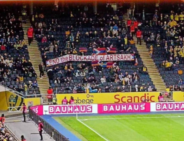 Շվեդիա-Ադրբեջան ֆուտբոլային հանդիպման ժամանակ մարզադաշտում երկրպագուները պարզել են Արցախի և Հայաստանի դրոշները և մեծ պաստառ՝ դադարեցրե՛ք Արցախի շրջափակումը գրառմամբ։