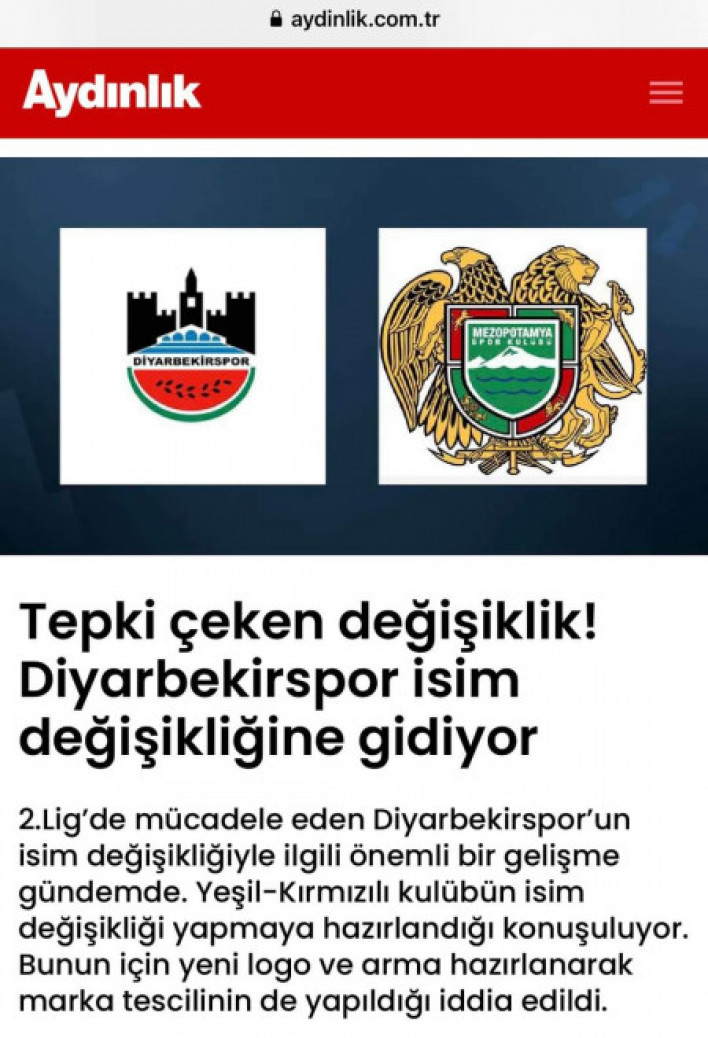 Թուրքական «Դիարբեքիր սպորտ» ֆուտբոլային ակումբը փոխել է անվանումն ու զինանշանը ՝ պատճենելով այն Հայաստանի զինանշանից։ Ակումբի նոր անվանումն է «Միջագետքի մարզական ակումբ», իսկ նոր լոգոն կրկնում է Հայաստանի զինանշանը աննշան փոփոխություններով: