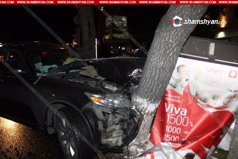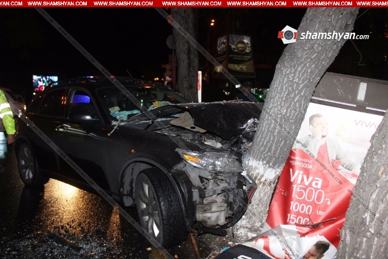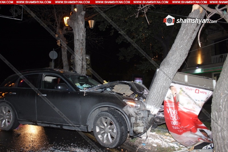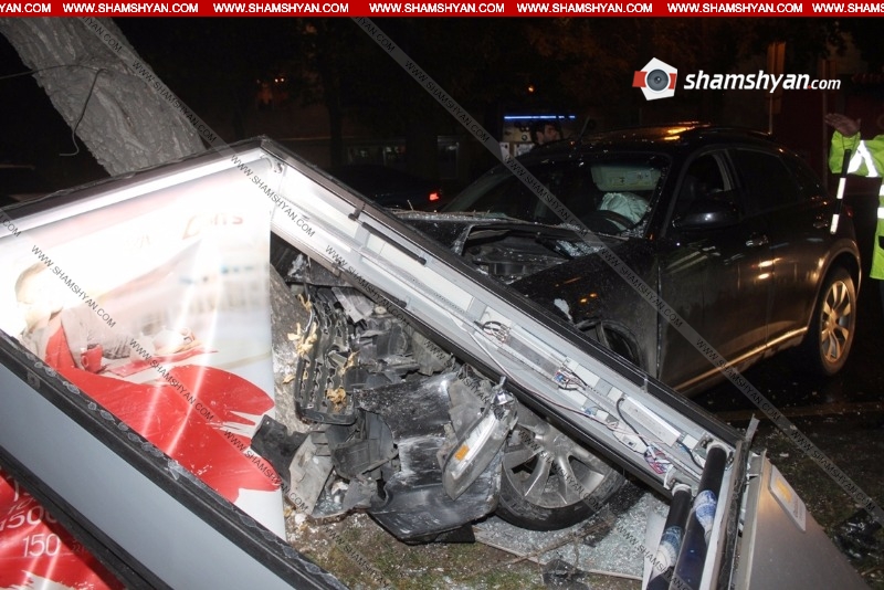 Խոշոր ավտովթար Երևանում. 23-ամյա վարորդը Infiniti-ով բախվել է հաստաբուն ծառին և գովազդային վահանակին՝ տապալելով այն. ՖՈՏՈՌԵՊՈՐՏԱԺ