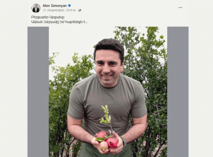 Եվ սա այն Ալեն Սիմոնյանն է, ով նռան շոու էր կազմակերպել Աղդամում՝ հայտարարելով, թե Ակնան (Աղդամը) իր հայրենիքն է։ Ալենը դա անում էր 2018–ի իշխանափոխությունից հետո՝ փորձելով ցույց տալ, թե, իբր, իրենք հակադրվում են Սերժ Սարգսյանին, ով տարիներ առաջ հեգնանքով էր արտահայտվել այն մարդկանց մասին, ովքեր ասում էին, թե Աղդամն իրենց հայրենիքն է։