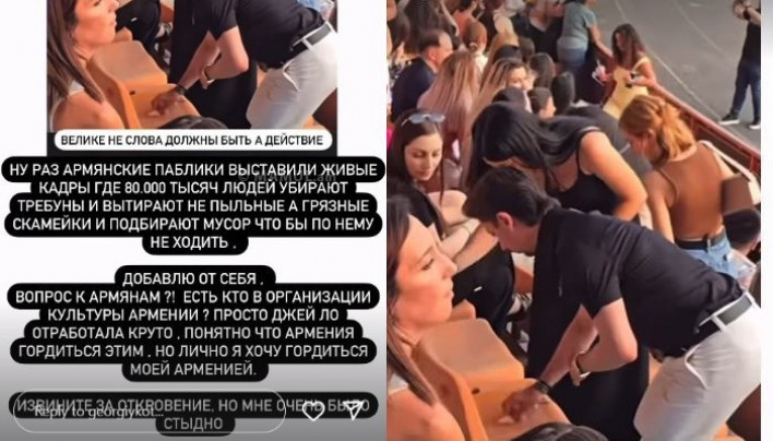 Վարսավիրական արվեստի աշխարհի կրկնակի չեմպիոն, Ռուսաստանի դիզայներների միության անդամ հայազգի Գեորգի Կոտն, ով իր թիմի հետ մասնակցել է Ջենիֆեր Լոպեսի երևանյան համերգին, «Ինթագրամ»-ի իր էջում լուսանկար է հրապարակել, որում մաքրում է «Վազգեն Սարգսյան» մարզադաշտի «ոչ թե փոշոտ, այլ կեղտոտ» նստարանը: Նա նաև հավելել է, որ հանդիսատեսը ստիպված ինքն էր մաքրում իր ոտքերի տակ ընկած աղբը, որ կարողանա առաջ գնալ: