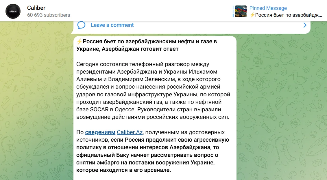 Ադրբեջանի ՊՆ-ի հետ փոխկապակցված (ըստ որոշ փորձագետների) «Caliber.az»-ը՝ հղում անելով «հավաստի աղբյուրներից ստացված տեղեկությանը», գրել է․ «Եթե Ռուսաստանը շարունակի իր ագրեսիվ քաղաքականությունը Ադրբեջանի շահերի նկատմամբ, ապա պաշտոնական Բաքուն կսկսի քննարկել իր զինանոցում գտնվող զենքի՝ Ուկրաինային մատակարարելու վրա դրված արգելքի վերացման հարցը»։