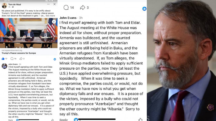 Ահա ՀՀ-ում ԱՄՆ նախկին դեսպան Ջոն Էվանսի այսօրվա մի գրառում, որը նա թողեց փորձագետ Թոմաս դե Վաալի հոդվածի տակ։ Ստորեւ նրա սենսացիոն գնահատականն է TRIPP-ի կամ «Թրամփի ճամփայի» վերաբերյալ։