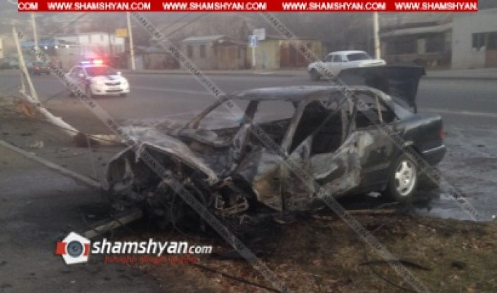 Խոշոր ավտովթար-հրդեհ Վանաձորում. 24-ամյա վարորդը Mercedes-ով տապալել է էլեկտրասյունը. մեքենան վերածվել է մոխրակույտի