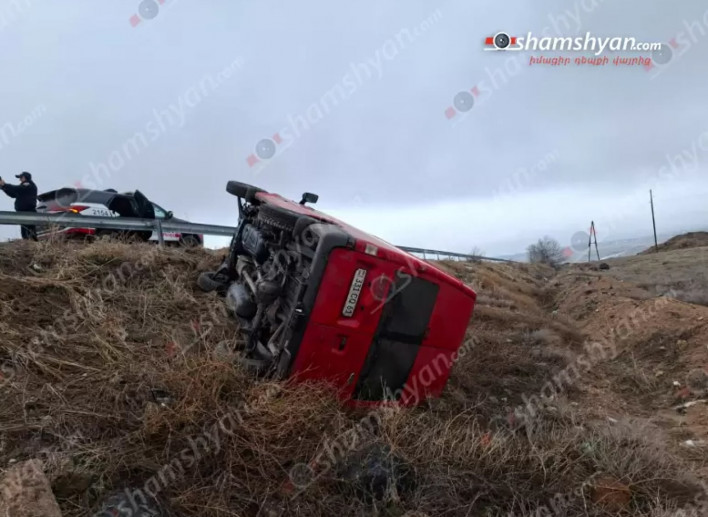Երևան-Գյումրի ավտոճանապարհին «Ford Transit»-ը բшխվել է երկաթե արգելապատնեշներին և կողաշրջված հայտնվել դաշտում