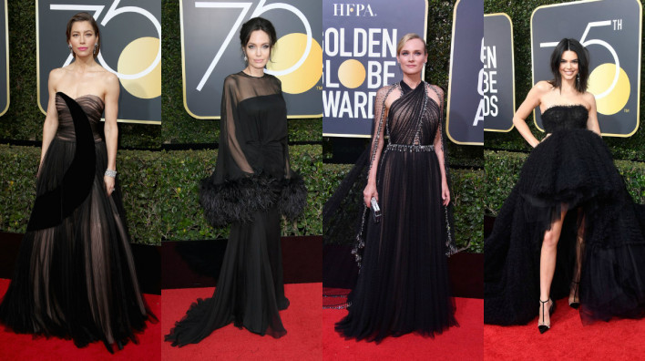 «Ոսկե Գլոբուս»-ի կարմիր գորգը «երազանքների զգեստի» մարաթոն է հիշեցնում, բայց այս տարի այն տարբերվում էր նախորդներից: 75-րդ մրցանակաբաշխությանը ներկա կանանց մեծամասնությունն ընտրել էր սև զգեստ՝ որպես բողոք սեքսուալ ոտնձգությունների և տղամարդկանց ամենաթողության: