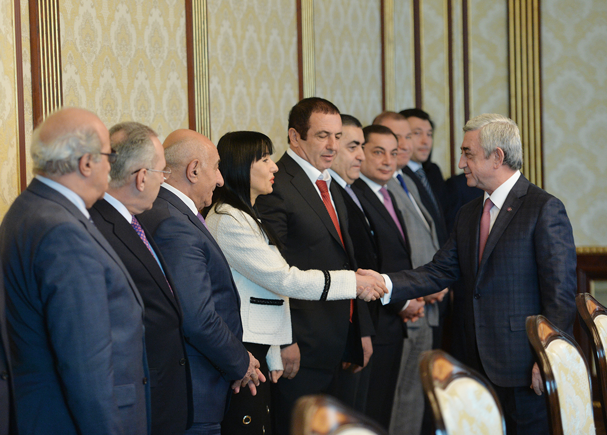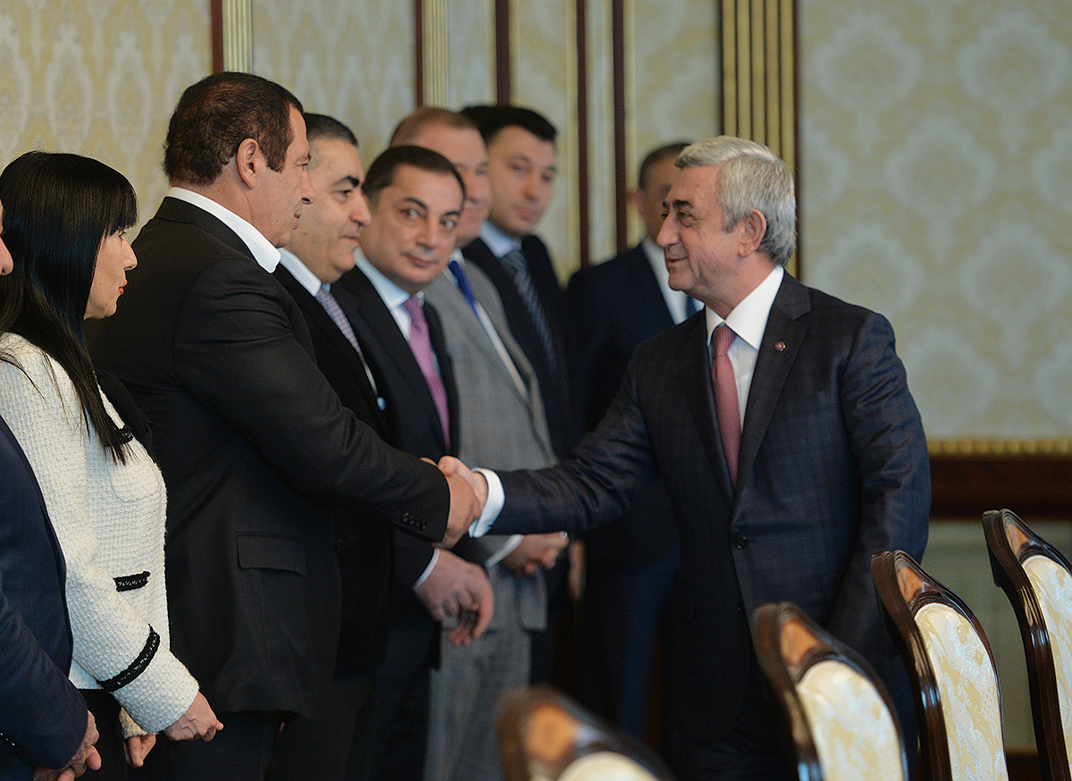 Նախագահ Սերժ Սարգսյանն այսօր հանդիպում է ունեցել Ազգային ժողովի ղեկավար կազմի հետ: Հանդիպման սկզբում Հանրապետության Նախագահը նշել է, որ թեև պարբերաբար հանդիպում է ունենում ԱԺ նախագահի, այլ պատգամավորների հետ, սակայն նման ձևաչափով հանդիպումն աննախադեպ է և նպատակ ունի առավելապես կենտրոնանալու Սահմանադրության փոփոխություններից հետո կառավարման նոր համակարգի պայմաններում իրականացվելիք մեծ ծավալի աշխատանքի, բոլորին հուզող արդիական մի շարք հարցերի վրա՝ նկատի առնելով, որ ԱԺ գործունեության իր տեսլականի մասին հանգամանորեն խոսել է դեռևս անցյալ տարվա մայիսի 18-ի ծավալուն ելույթում, և այդ ուղերձի դրույթներին կրկին չի անդրադառնա: