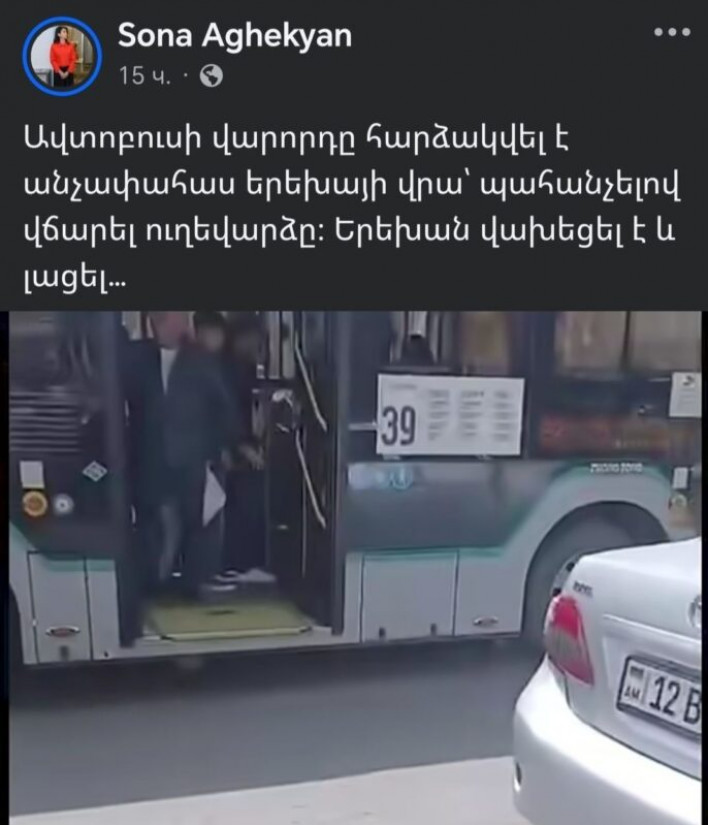Ի պատասխան ֆեյսբուքյան օգտատեր Սոնա Աղեկյանի՝ 26․04․2026 թ․ «Ավտոբուսի վարորդը հարձակվել է անչափահաս երեխայի վրա՝ պահանջելով վճարել ուղեվարձը» վերտառությամբ գրառման և կից տեսանյութի՝ հայտնում ենք՝ տեղի ունեցած միջադեպը եղել է երկու ուղևորների միջև, երբ ամենայն հավանականությամբ առողջական խնդիրներ ունեցող երեխան կատարել է անկանոն շարժումներ, այդ թվում՝ ձեռքը մեկնել է մեկ այլ՝ մանկահասակ երեխայի ուղղությամբ, ինչից հետո վերջինս վախեցել է և սկսել գոռալ, իսկ մյուս ուղևորը, որը եղել է ծնողի կամ խնամակալի հետ, իջել է ավտոբուսից։ Տեսանյութը արվել է հենց այդ պահին, և անգամ տեսանյութում երևում է լուռ նստած վարորդը։ Այս մասին հայտարարություն է տարածել «Երևանի ավտոբուս» ՓԲԸ-ն։