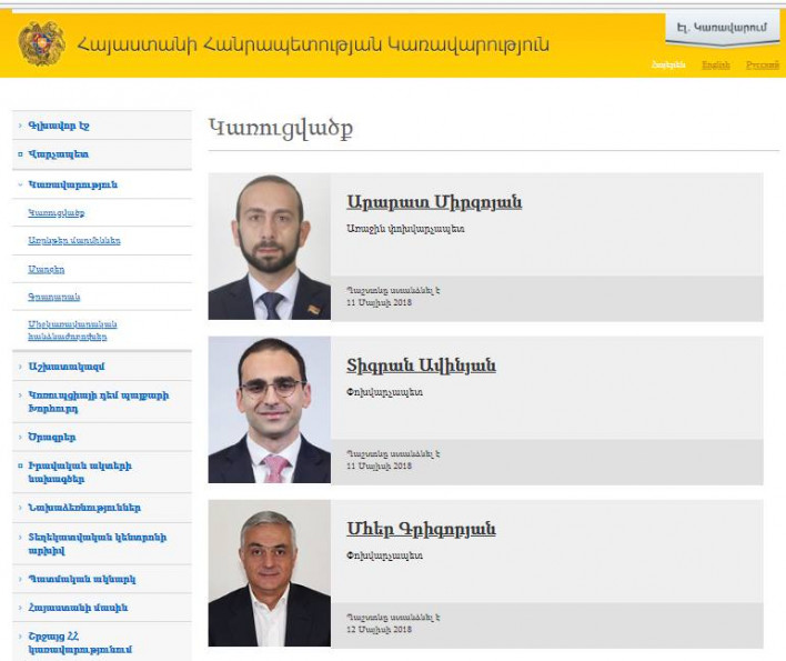 Կառավարության կայքը՝ gov.am, սկսվում է/ր առաջին փոխվարչապետով, կարծես գործադիրի ղեկավարը հենց նա է և ոչ թե վարչապետը։