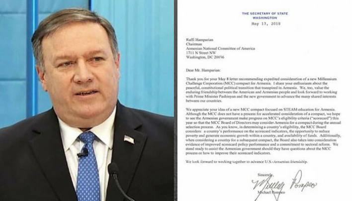 «Մենք պատրաստ ենք քննարկել Հայաստանին «Հազարամյակի մարտահրավեր» (ստեղծված 2004թ. աշխարհի աղքատ երկրների տնտեսությունների զարգացման համար Պետդեպարտամենտի ծրագրի շրջանակներում) կորպորացիայի միջոցով 140 միլիոն դոլարի դրամաշնորհ տրամադրելու հարցը: Սակայն Հայաստանը ծրագրին մասնակցելու համար պետք է երկրում տեղի ունեցած դրական փոփոխությունների մասին տեղեկացնի»,- իր նամակում նշել է Փոմփեոն: